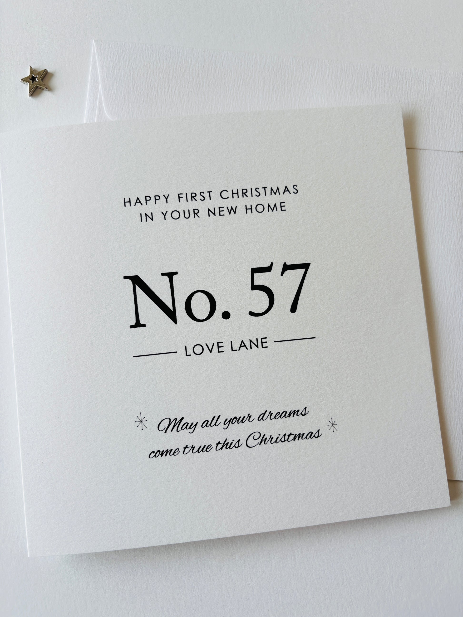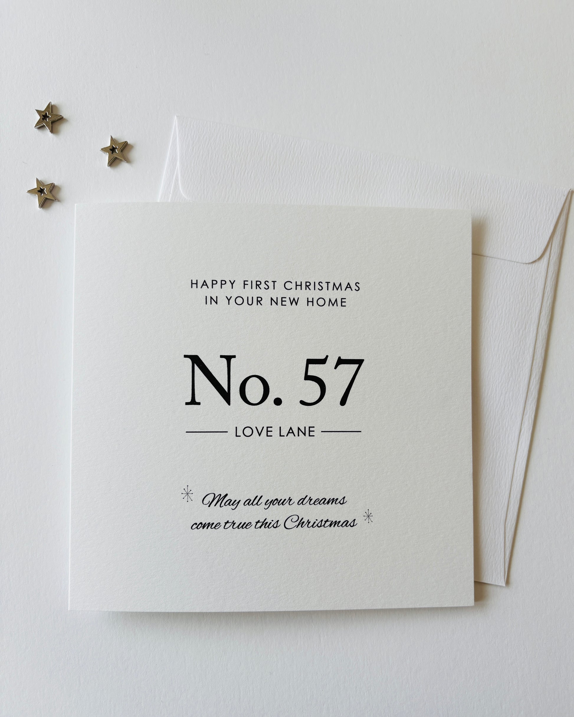 A contemporary and modern personalised Christmas card for anyone celebrating their first Christmas in a new home.