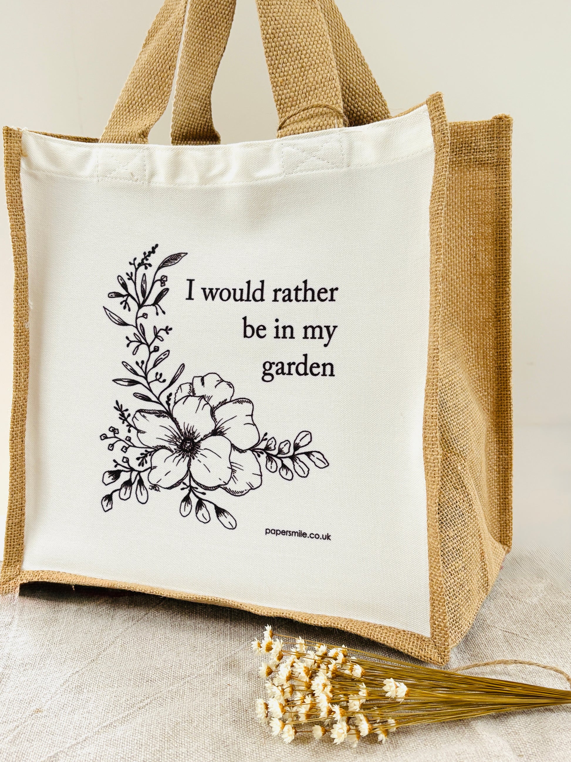 With the words printed in black on one side: I would rather be in my garden. Alongside our own original floral illustration.