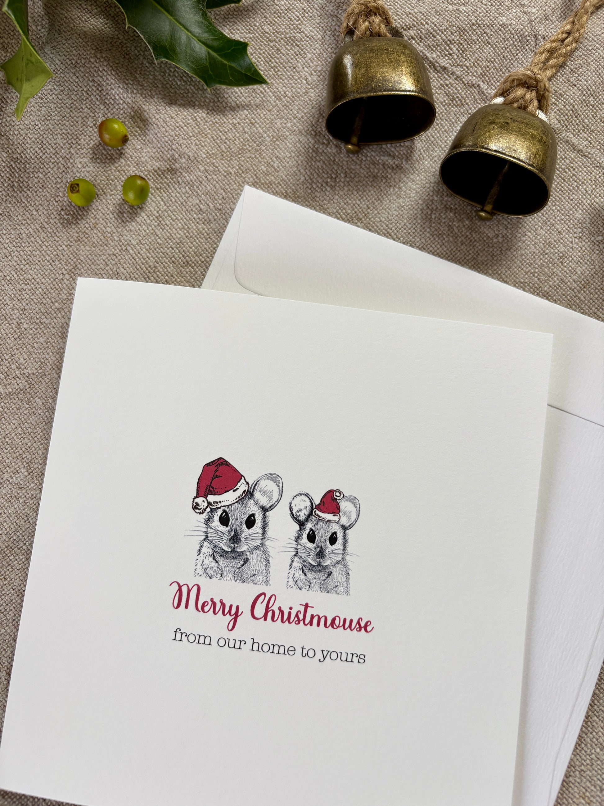 This joyful Christmas card features our very own, hand-drawn cheeky little mice wearing Santa hats, adding a playful and delightful touch to your festive greetings.