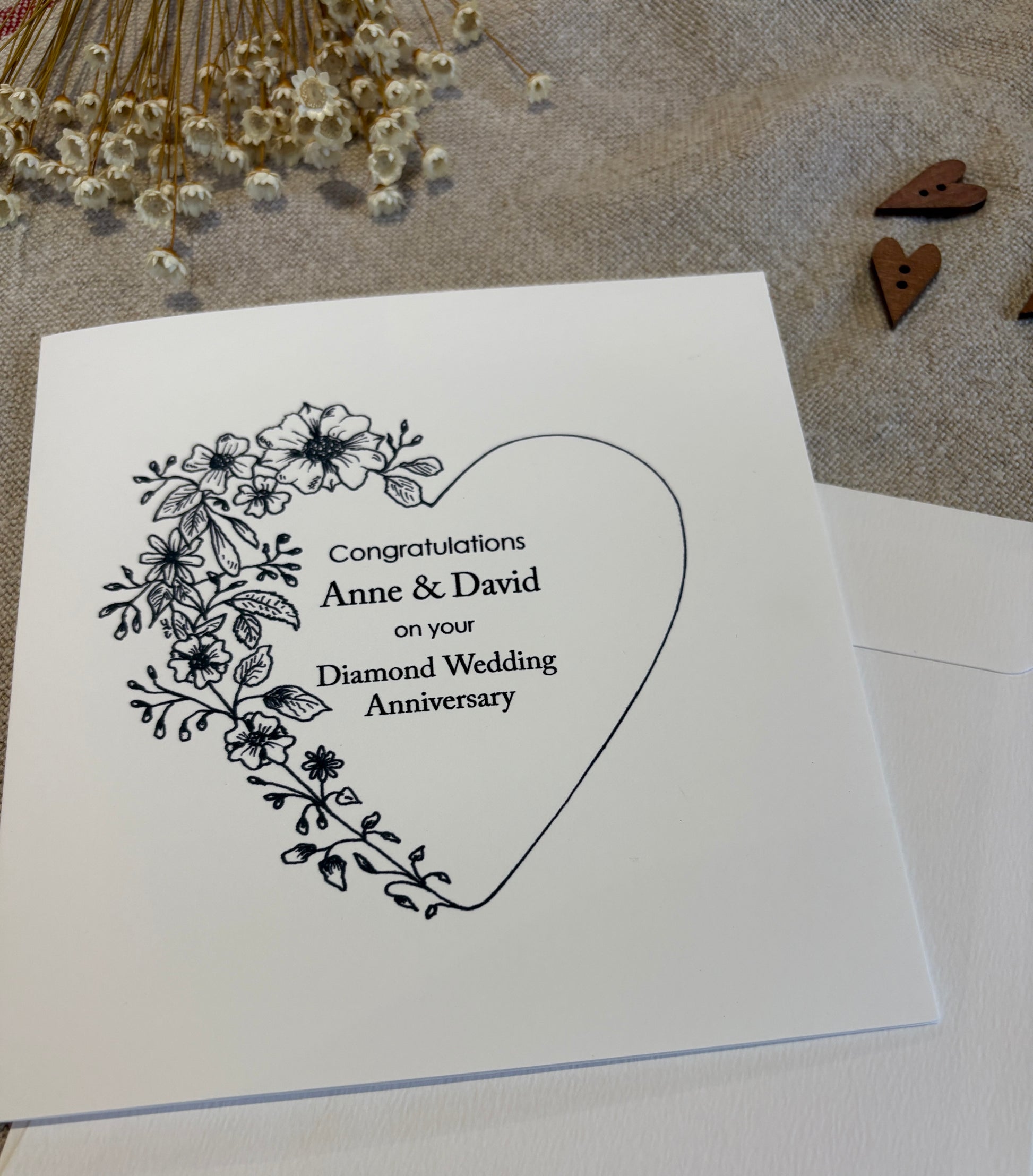 Card example reads: Congratulations Anne & David on your Diamond Wedding Anniversary.