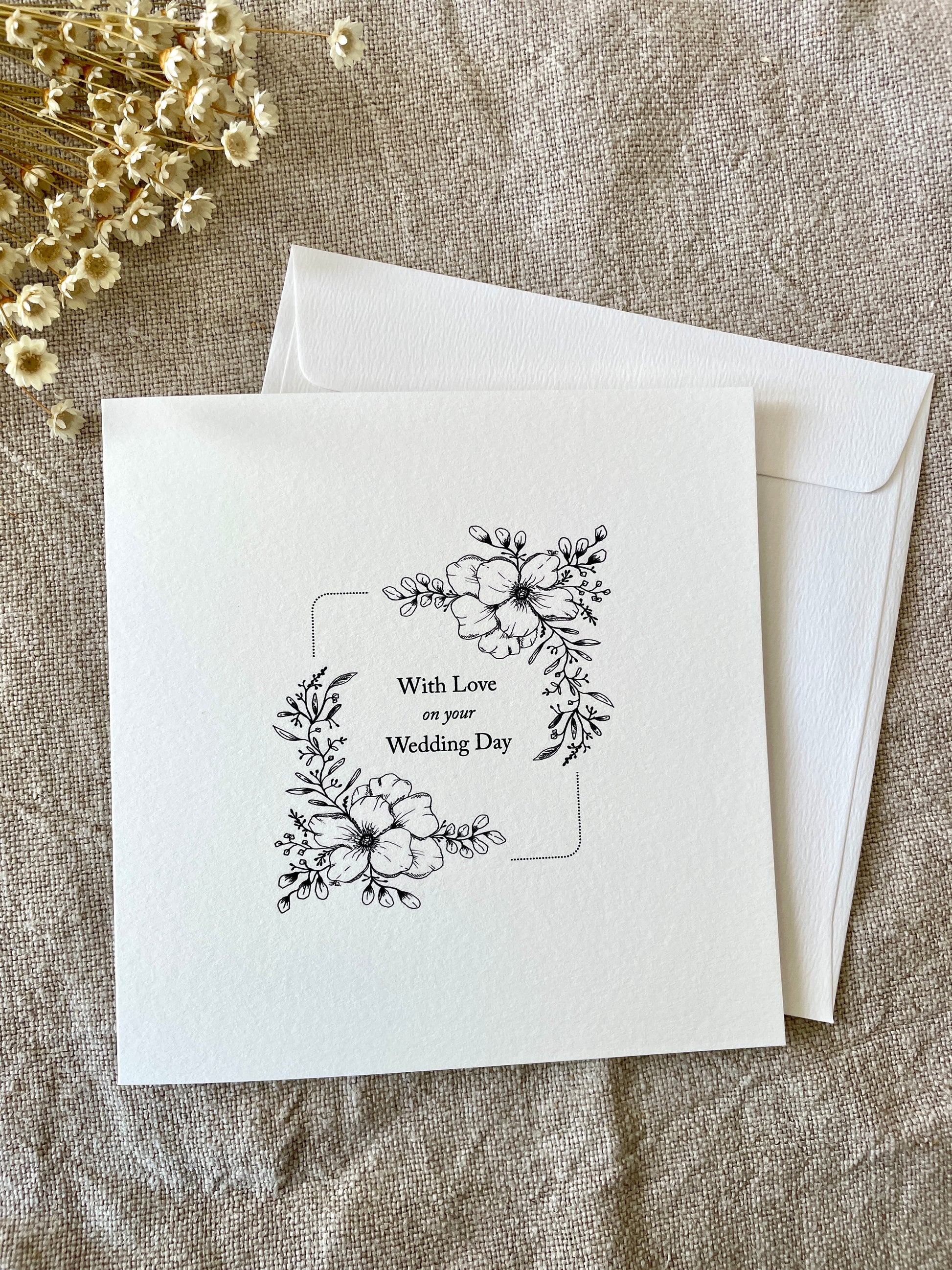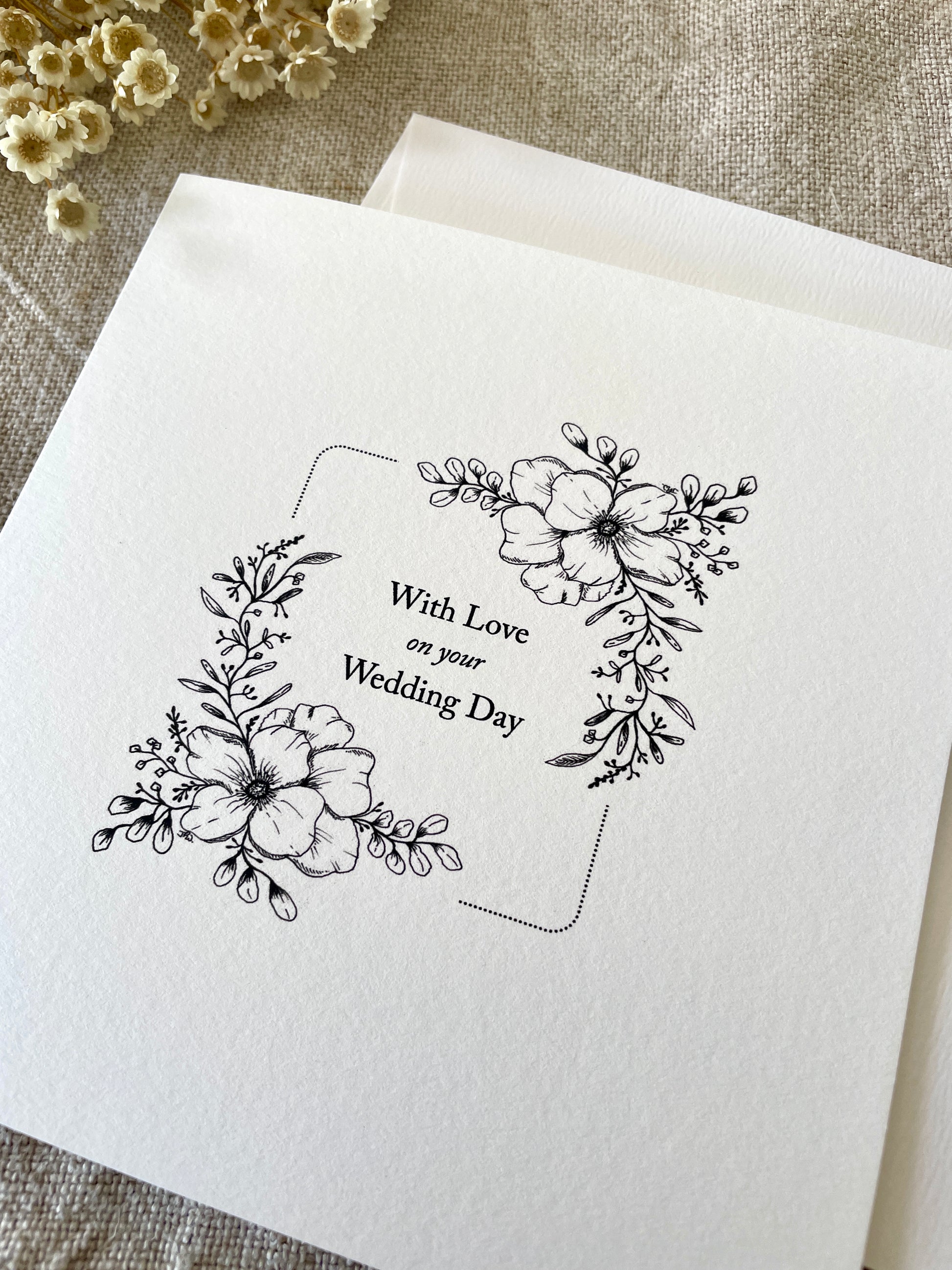 Celebrate the joy of a wedding day with this elegantly crafted card, designed to convey heartfelt congratulations to the happy couple.