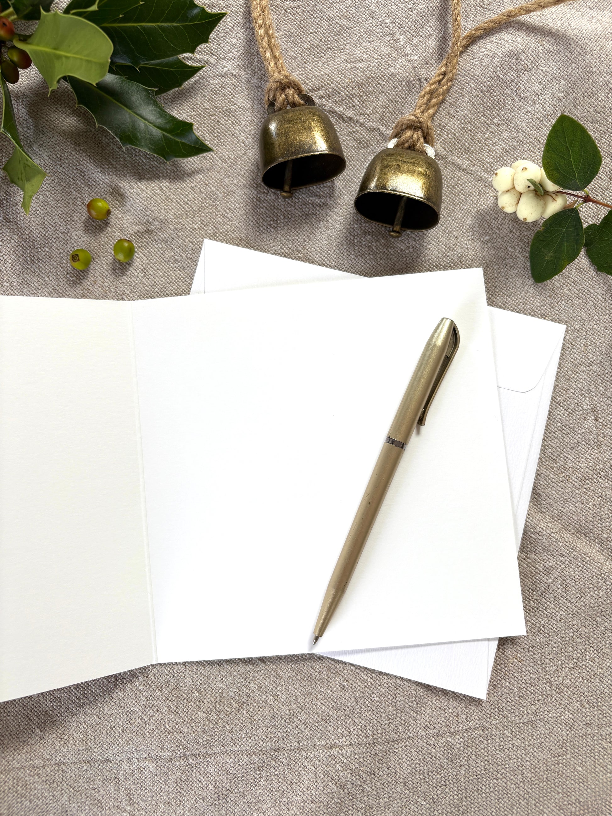 Printed on the most beautiful Italian 300gsm card stock for a superb quality feel. Left blank inside for your own message. Supplied with an antique white textured peel and seal envelope for a luxury finish.