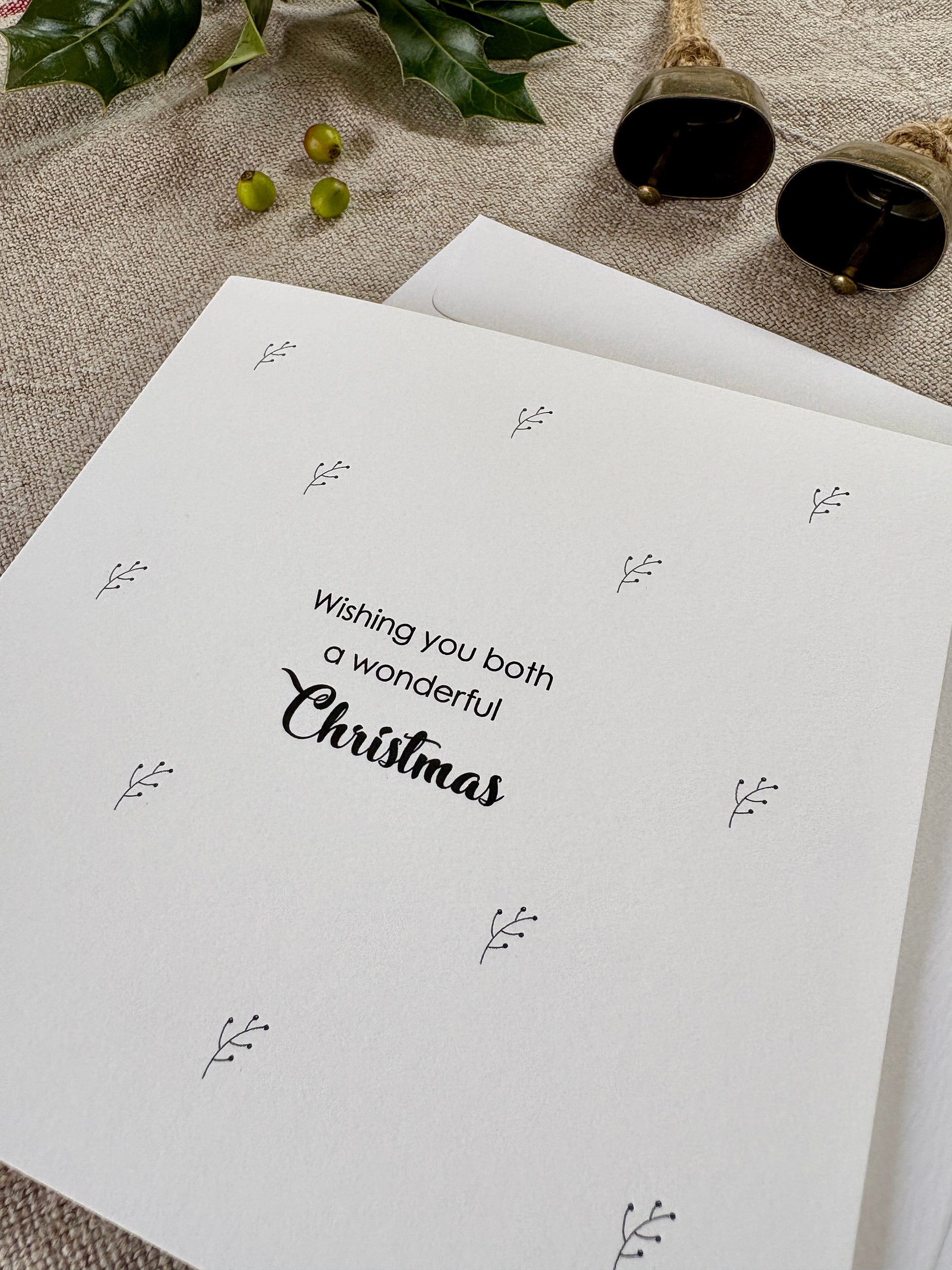 A contemporary Christmas card with a delicate, hand-illustrated sprig of berries, with the words 'Wishing you both a wonderful Christmas'